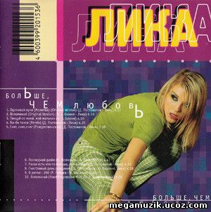 ЛИКА - Больше, чем любовь 1996Голос: Лика Павлова Россия (г. Москва) 01. Одинокая луна Доступно только для пользователей02. Вспоминай 03. Танцуй со мной, мой мальчик 04. Би-би такси (Remix) 05. Снег, снег, снег 06. Последний дюйм 07. Разве есть что-то больше, чем любовь 08. Счастливый день рождения 09. В ритме - 200 10. Вспоминай (Mix)
